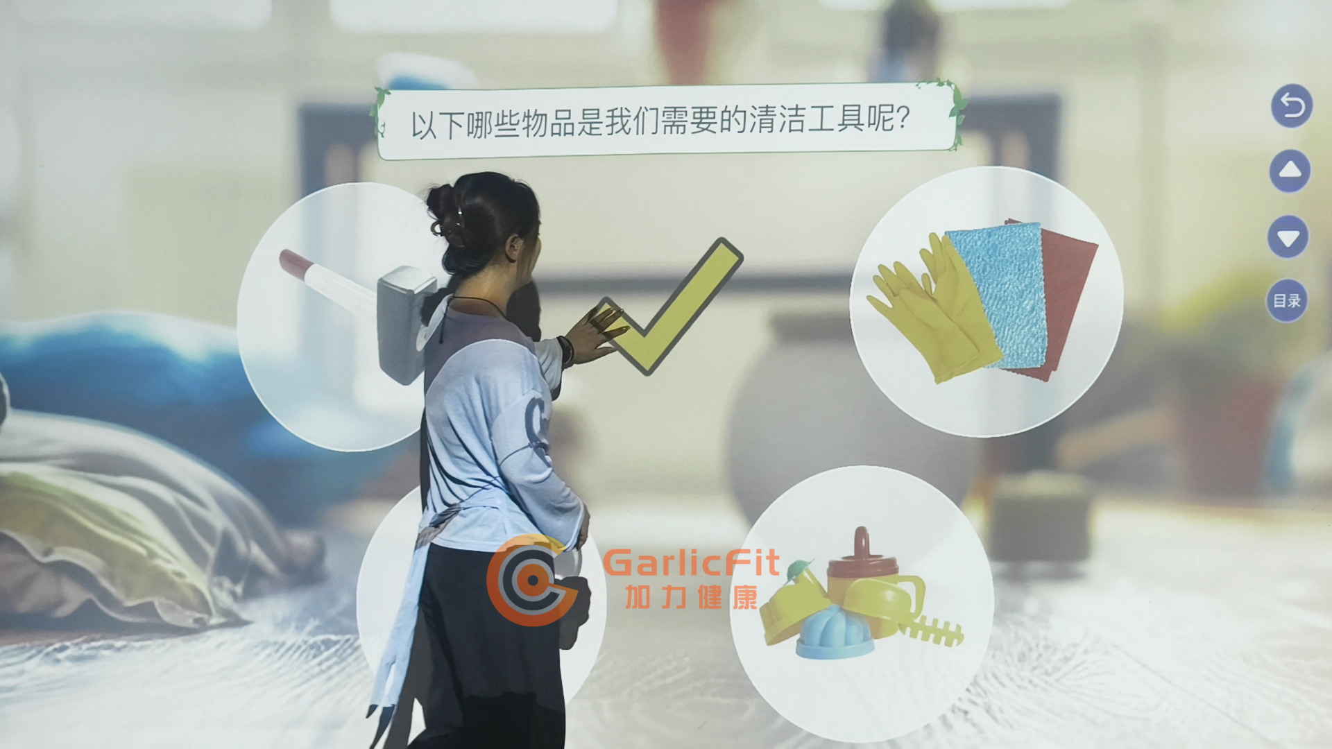 加力健康认知训练互动墙采用大面积墙面投影技术,将记忆、常识、逻辑、生活技能等多类别训练内容投射在墙面上。长者只需站立参与,通过情景互动、趣味问答的形式就能完成认知学习,无需佩戴设备、不用复杂操作,全程轻松简单、互动性强,彻底改变传统纸笔训练的枯燥模式,让长者愿意练、主动练、坚持练。
