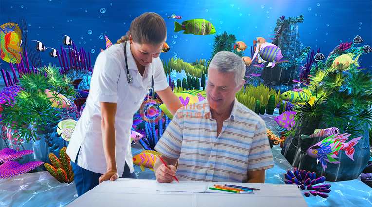 “互动美术康复系统”通过让老年人感受绘画作品转变为3D动画的奇妙绘画体验,从而提升老年人认知,帮助训练大脑,预防认知障碍、老年孤独的现象。让参与者涂鸦填色、自主创作美术作品,再将作品扫描转变为大屏幕活泼乱跳的动画,还可与动画互动。沉浸式的主题场景,仿佛与作品置身一体,给予心灵安静、放松的体验。